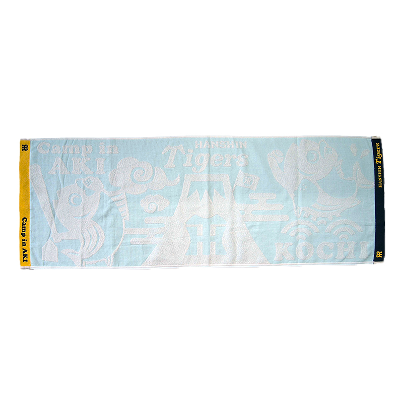 タイガースのロゴマークとCamp in Akiの文字が入った安芸限定のスポーツタオルです。今治製のジャガード織りで、吸水性も抜群です。